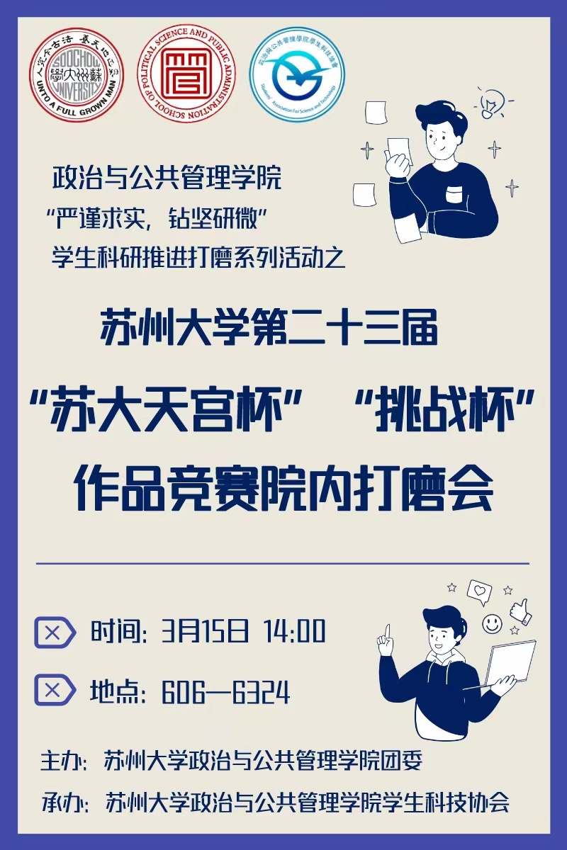 海报 | 必威西汉姆联“严谨求实,钻坚研微”学生科研推进打磨系列活动之必威betway西汉姆联第二十三届“苏大天宫杯”“挑战杯”作品竞赛院内打磨会