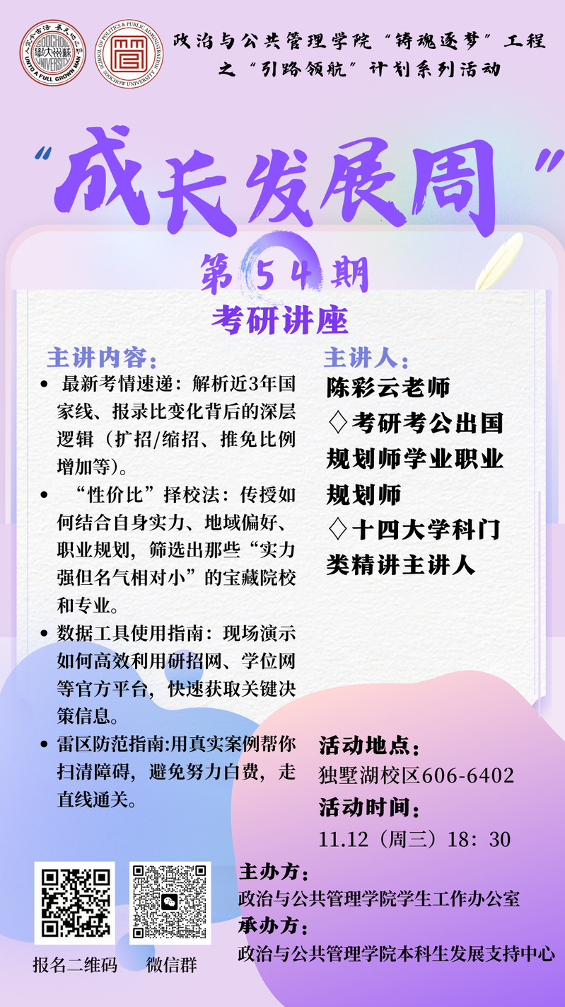 海报 | “铸魂逐梦”工程“引路领航”计划——成长发展周第54期《考研讲座》